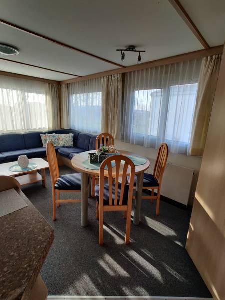 Das Mobilheim steht auf ca. 200 m² Mietgrund, geschützt und windstill. Rundum befindet sich eine angenehme Mischung aus Sonnen- und Schattenplätzen, sodass Sie zu jeder Tageszeit einen gemütlichen Sitzplatz finden können.