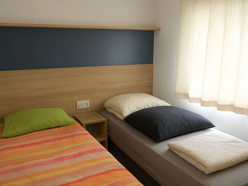 De tweede slaapkamer heeft twee eenpersoonsbedden. Boven deze bedden hangen bovenkastjes zodat er ruimte is voor bagage of bedlinnen.